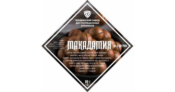 Ingredients: inshell macadamia nut. coconut sugar. coconut chips, dried orange, cinnamon. Recipe: Pour the ingredients from the package with 1 liter of high-quality double-distilled moonshine with a strength of 40%. Stir and remove in a cool dar..