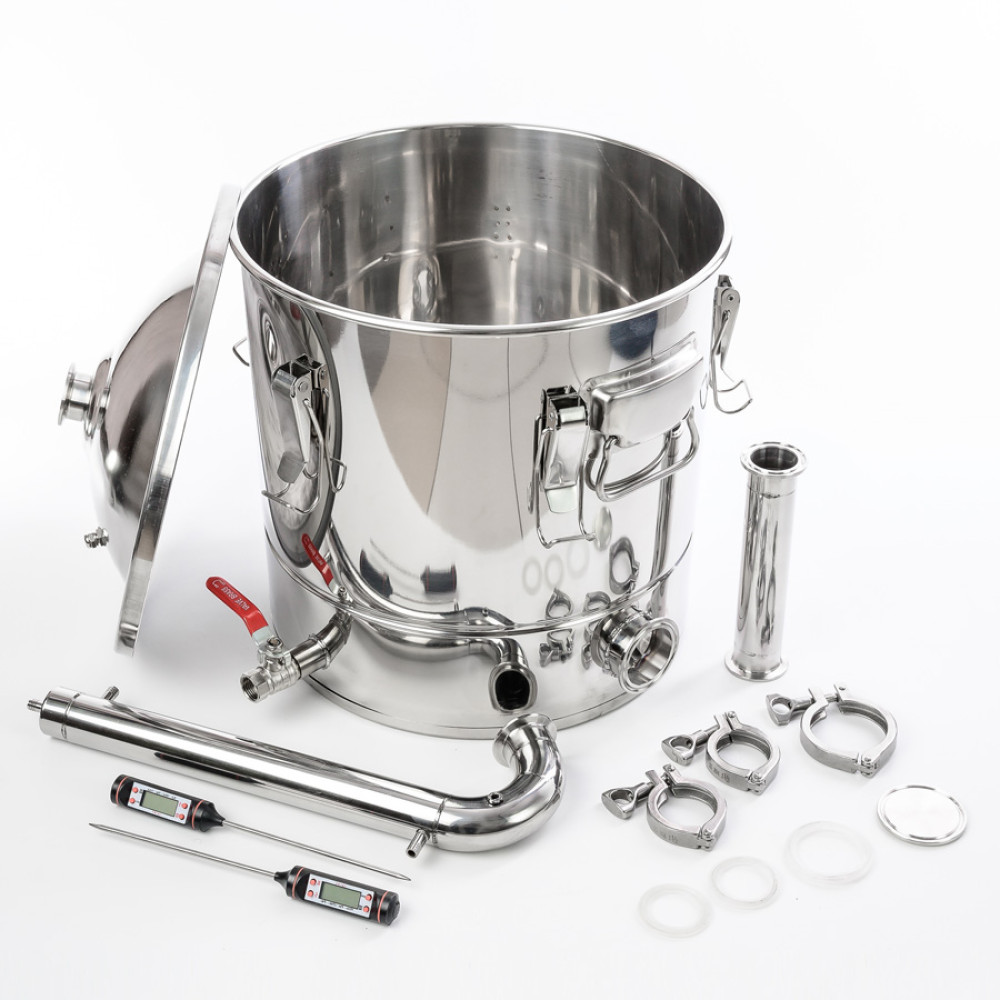 Another indisputable advantage is the universal design of the distillation cube and clamp connections of the entire structure. The distillation cube is equipped with a wide lid, which is easily and quickly fixed with 5 reliable clamps, which makes it possible to use even thick mash made on the basis of malt or jam. Also, the distillation cube is equipped with a 5 mm sandwich bottom for use on induction cookers. At the bottom of the distillation cube there is a 2-inch clamp for quick installation of heating elements with a corresponding clamp fastening. For convenient drainage of the stillage remaining after distillation, a ball drain valve is installed in a 30-liter distillation still. An additional difference of this model is the inner groove around the alembic circumference for installing a false bottom with a diameter of 350 mm above the level of the mounting bracket for heating elements.